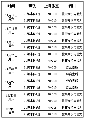 2021级本科教师资格证课程将于本周六开始继续上课,现将本次课程安排公布如下: