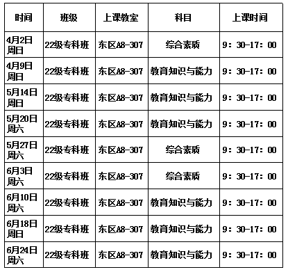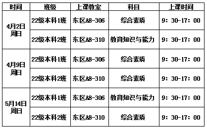本学期2022级本科、2022级专科教师资格证将于本周日(4月2日)在东区开课,具体课程安排如下: