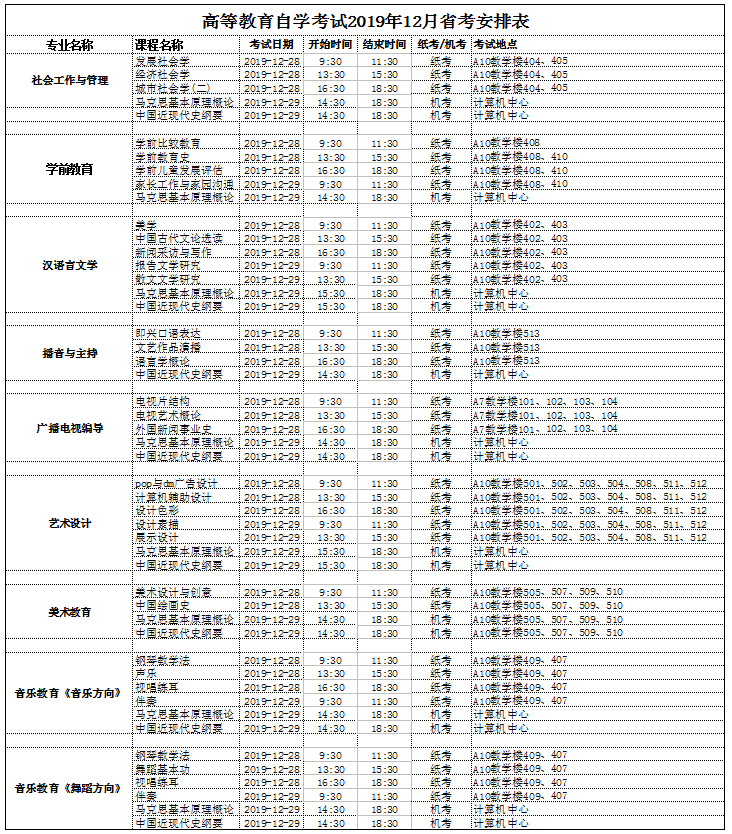 2019年12月省考音乐教育(音乐方向、舞蹈方向)坐签查询表